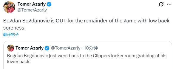 虽然博格丹对快船总裁劳伦斯-弗兰克说:我的身体没事;但初步检查之后,快船官方宣布,博格丹因下背部酸痛不会回归。